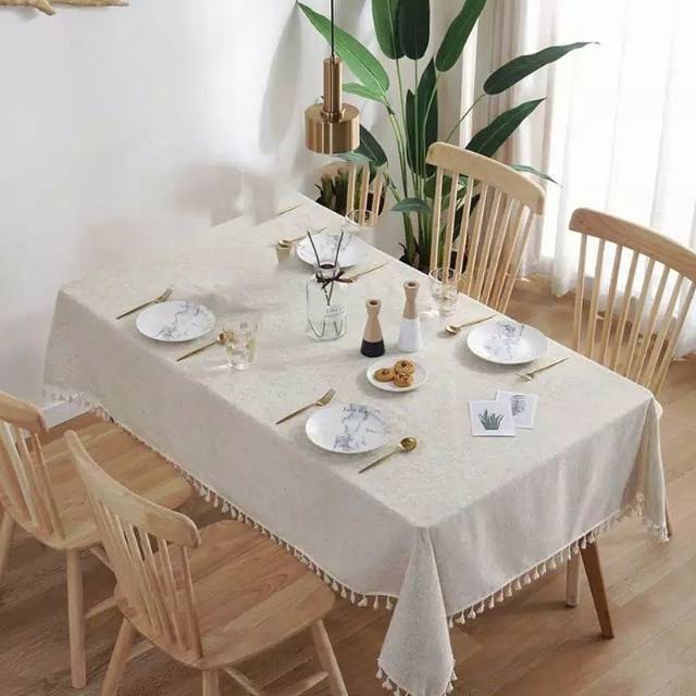 Meskipun bukan elemen wajib, taplak meja bisa membantu tampilan meja makan kamu menjadi lebih cantik. Taplak meja juga dapat melindungi permukaan meja kamu dari makanan dan kotoran lainnya serta membantu menahan panas agar tidak cepat rusak.